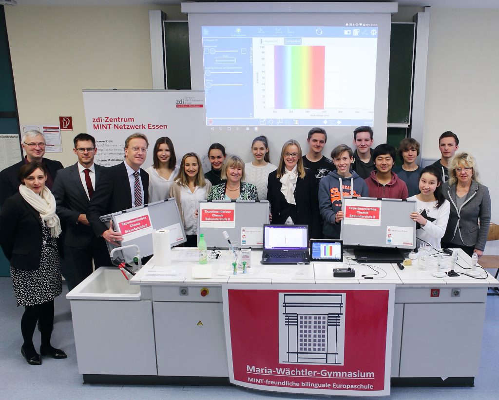 14.11.2016 – Ab sofort haben Essener Schülerinnen und Schüler Gelegenheit, im Chemie-Unterricht die Konzentration von Säuren oder Laugen zu bestimmen und die Eigenschaften von Stoffen mit Hilfe ihrer Farbigkeit zu untersuchen – und zwar computergestützt. Möglich machen das drei Experimentierboxen, die die Sparkasse Essen dem zdi-Zentrum MINT-Netzwerk Essen und damit allen interessierten Lehrerinnen und Lehrern der Stadt übergeben hat. Den ersten Praxistest haben die in den Boxen enthaltenen Geräte schon bestanden: Im Rahmen der Übergabe am Maria-Wächtler-Gymnasium haben Schülerinnen und Schüler des 10. und 12. Jahrgangs einige der möglichen Versuche erfolgreich durchgeführt.