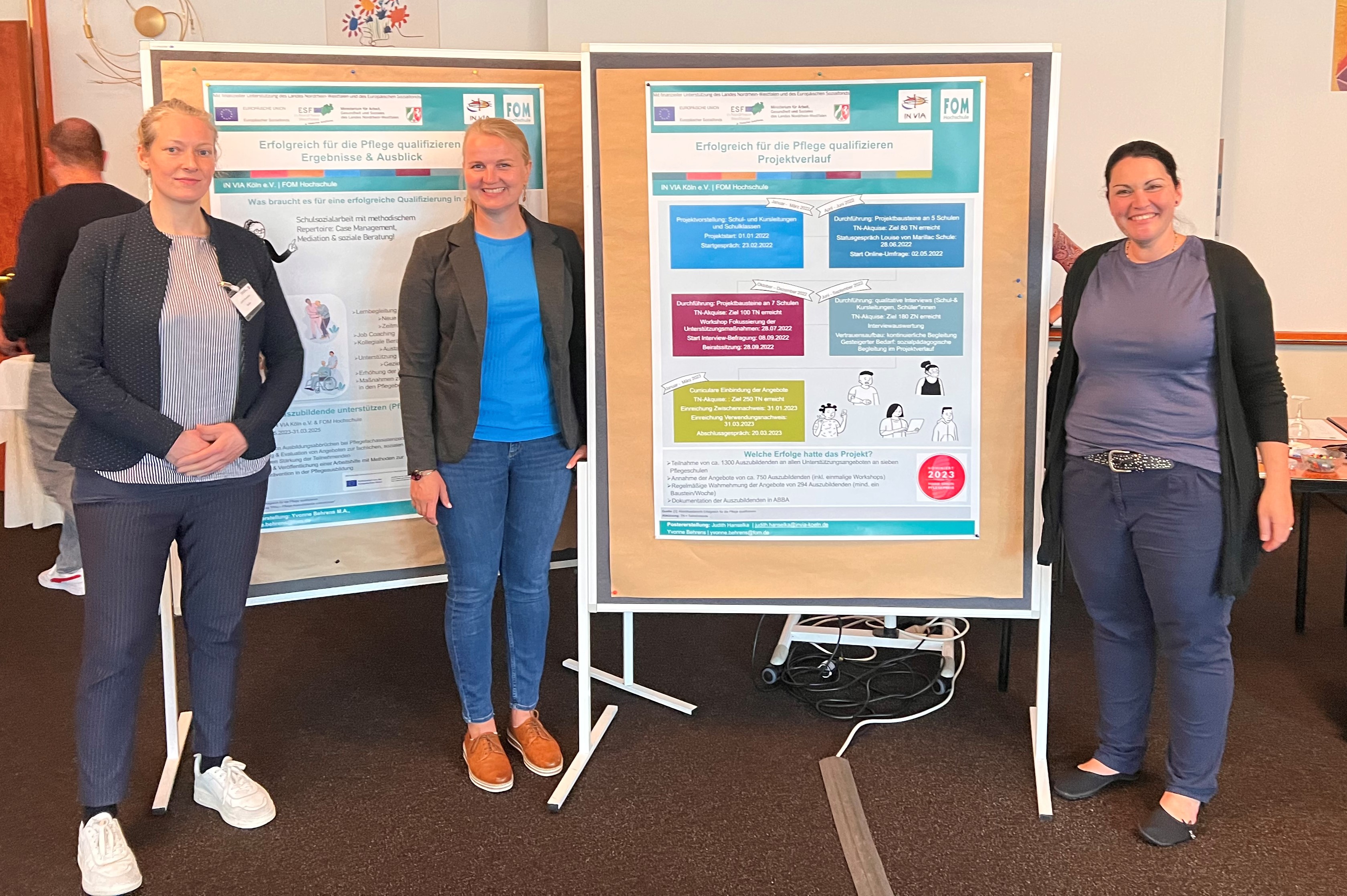 Das Projektteam präsentierte die Ergebnisse aus dem Projekt „Erfolgreich für die Pflege qualifizieren“ sowie die Ziele und das Vorgehen im Projekt PfAu bei der Tagung der Verwaltungsbehörde des Europäischen Sozialfonds (ESF) und vor Vertretenden des Ministeriums für Arbeit, Gesundheit und Soziales des Landes Nordrhein-Westfalen (MAGS NRW) im September 2023 in Unna sowie bei der Tagung des Bundesverbands Lehrende Gesundheits- und Sozialberufe (BLGS) im Oktober 2023 in Dortmund. „Die Tagungsteilnehmenden lobten die Projekte, insbesondere die Unterstützungsangebote und Evaluationsdaten. Der hohe Bedarf an Unterstützung in der Pflegeausbildung wurde deutlich“, resümiert Prof.in Keller. „Das verdeutlicht nochmals die Relevanz, die Gesamtsituation der Pflegefachassistenzausbildung in NRW im Rahmen des Projekts zu erheben. Wir freuen uns, dass wir an der FOM Hochschule diesen Beitrag leisten können“, ergänzt Prof.in Bieler.